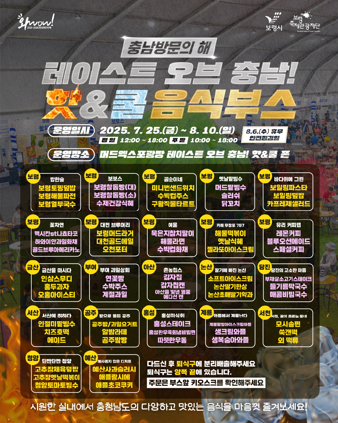일시 : 2025. 7. 25.(금) ~ 8.10.(일) (8.6휴무) 장소 : 머드엑스포광장 테이스트오브 충남 핫앤쿨존
